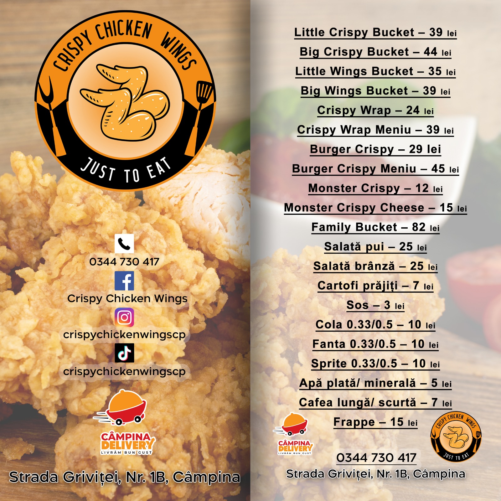 Suntem un restaurant fast-food local, situat în Câmpina, pe strada Griviței nr. 1B, și te așteptăm mereu cu zâmbetul pe buze și mâncarea perfectă pentru orice moment al zilei. Indiferent că vrei o gustare rapidă sau o masă completă, Crispy Chicken Wings este alegerea ideală pentru gustul autentic și calitatea garantată.